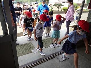 災害時を想定して上ばきのままで避難するので、教室に戻る前には上ばきの底をきれいにしてから入りました。