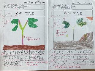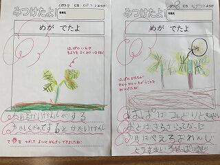 国語の『かんさつ名人になろう』の学習として、先月植えた野菜の苗の観察を行いました。大きさや数、触った感じなど、いろいろな観点で気付いたことを記録することができました。