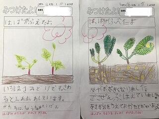 国語の『かんさつ名人になろう』の学習として、先月植えた野菜の苗の観察を行いました。大きさや数、触った感じなど、いろいろな観点で気付いたことを記録することができました。