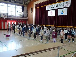 校長先生からは、学校教育目標の「やさしい子 かしこい子 たくましい子」に近付けたかの振り返りをすることや、春休みも、感染症予防対策を取って、健康に安全に過ごすようにとのお話がありました。