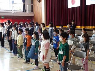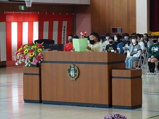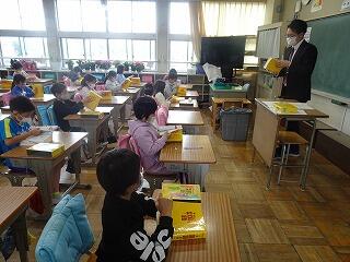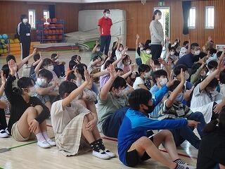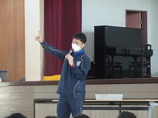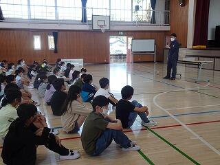 集会を体育館で行いました。学習指導主任と児童指導主任の先生からのお話です。
