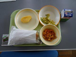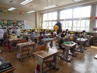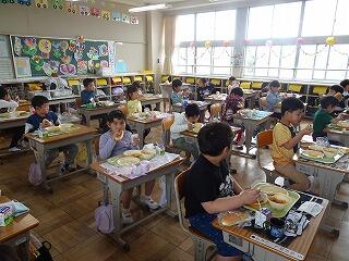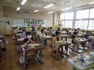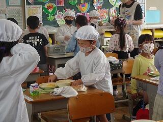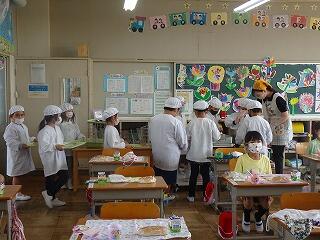 1年生の給食が始まって1週間が経ちました。自分たちで配膳室から食缶を運んできて、配ります。