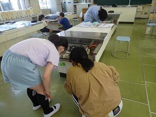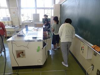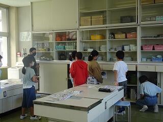 家庭科の学習で、5年生が家庭科室探検を行いました。どんな用具が、どこの棚に入っているのか友達と確認しました。