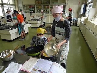 先日,家庭科の時間に6年生がスクランブルエッグ作りを行いました。昨年に引き続き,学級を2つに分けて半分の人数での調理実習です。すべての作業を一人で行い,試食・振り返りをします。