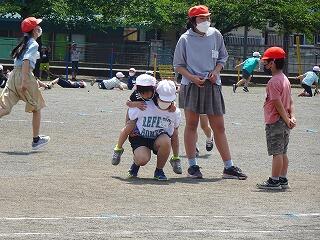 とってもいいお天気の中,2回目のふれあい共遊を行いました。校庭で班ごとに思いっきり遊ぶのは初めてです。