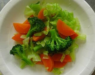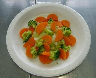 にんじんは水からゆで,ブロッコリーとキャベツはふっとうした湯でゆでます。