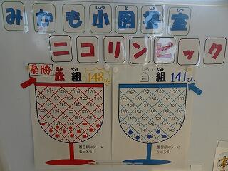 運動会で組み分けした赤白対抗で、どれだけ図書室の本を借りて読書をすることができるかを競いました。