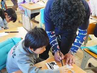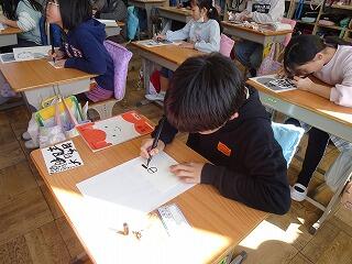 2年生と4年生にご指導いただき,「自分の名前をおもしろく書く」という新鮮な体験に,児童は楽しそうに取り組んでいました。また,児童同士で作品を見せ合い,「おもしろい!」「すごい!」という声が多く飛び交う,素敵な時間になりました。上岡さん,ありがとうございました。
