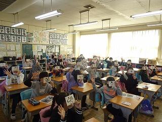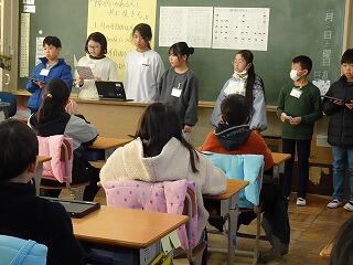 会は5年生の進行で、第一部は、ふれあい班ごとに教室を回ってクイズに挑戦しました。正解の答えをつなぐと6年生へのメッセージが出てきます。