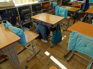 校舎内では、すぐに机の下にもぐって次の放送まで黙って待機しています。