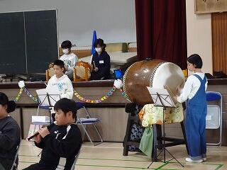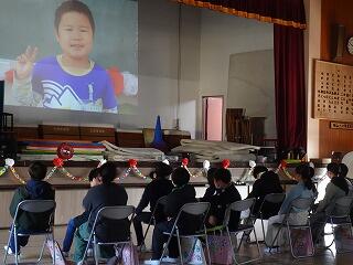 第二部は、6年生の思い出のスライド上映と、1~5年生からの感謝の言葉や歌、6年生からの言葉や八木節の演奏披露がありました。