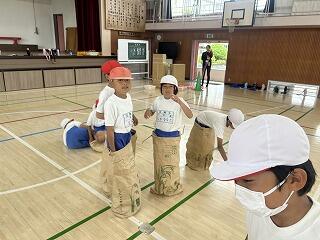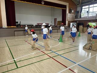 ご家庭に協力いただいた米袋をはき、全力でぴょんぴょんとびの練習をしました。