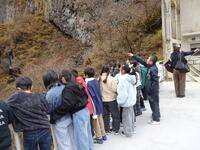 華厳滝では、大きなエレベーターに乗って、100m下まで下がっていきました。
