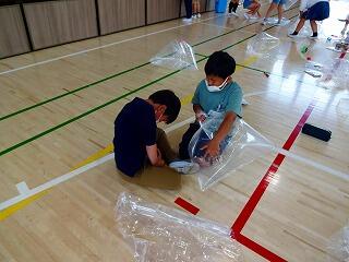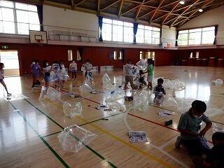 「ふわふわ空気のつみ木」 45Lの大きなビニール袋に空気を詰めて、友達と協力しながら制作しました。