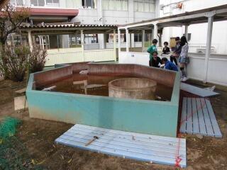 スイミー池の金魚がアオサギに食べられないように、校長先生とO先生で網をはりました。