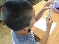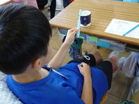 集中して光りを集めています。友達が「うまくいかないな。」とつぶやくと、「太陽の光が虫眼鏡に当たるように傾けるんだよ。」と優しく教えていました。