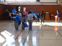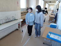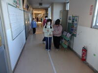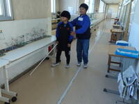 廊下では、廊下の端を歩いているのか中央を歩いているのかがよくわからなかったようです。白杖を使って、SOSの合図を事前に学習していたため、サポートの友達に助けを求めている友達もいました。
