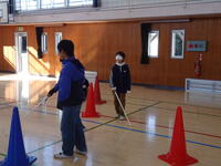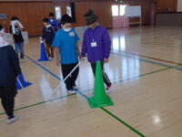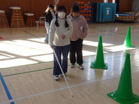 安全のために、ペアを組みました。アイマスクやマスク、その他の物を使って目隠しをしました。まずは、白杖を使って歩いてみます。白杖の使い方に気をつけて、ゆっくりと歩いています。