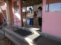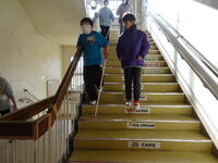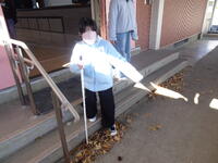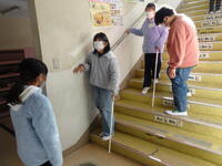 次は、階段の下りです。上りよりも「とても怖い。」と話していました。階段がどこまで続くのか、どれくらいの高さや幅なのか、毎日上り下りをしている階段でも、目隠しをすると途端に不安になり、足がすくんでいました。