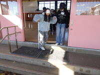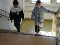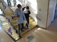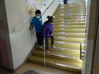 ペアで交代しながら、階段の上りを体験しました。教室で一度呼吸を整え、次は教室から体育館を目指します。