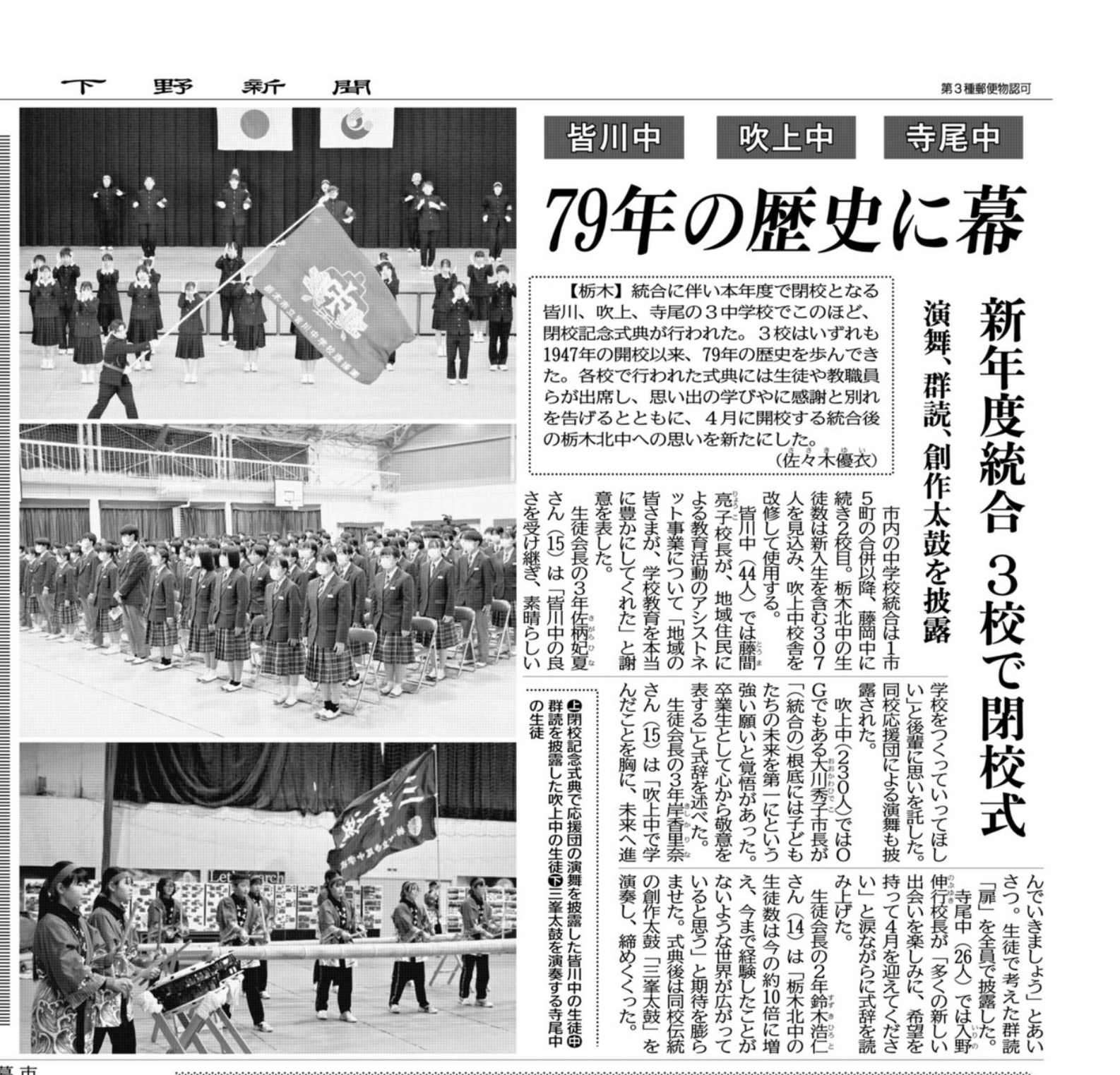 皆川中学校、吹上中学校、寺尾中学校の閉校記念式典の様子が、2月26日(木)下野新聞に掲載されました。それぞれの学校で準備を重ね、生徒の発表など、とても素晴らしい式典であったことが分かりました。