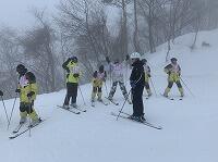 今日は少し霧がかり、雪の舞う中でしたが、班の仲間と協力し合いながら、スキーレッスンを受けています。初心者の生徒たちも、少しずつですが滑れるようになってきているようです。