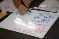 参観者は、理科班・算数班に分かれ、模造紙にまとめながら話し合いをすすめていきます。