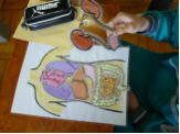 第1時間目は、まずからだの器官名やそのはたらき、臓器の位置など基本的なことを養護教諭お手製のラミネートした臓器シートや人体模型を使って学習しました。