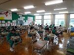 1年生は国語、グループで百人一首を楽しんでいます。CDから流れる読み札のスピードに四苦八苦していました。