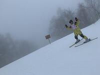 今日は少し霧がかり、雪の舞う中でしたが、班の仲間と協力し合いながら、スキーレッスンを受けています。初心者の生徒たちも、少しずつですが滑れるようになってきているようです。