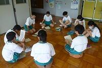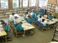 2年生は1・2組合同で図書室。グループ学習には最適ですが、