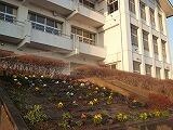 <美化委員会> 毎日昼休み、花に水をあげてくれています。美化委員のおかげで、たくさんの花が、きれいに咲いています。冬、楽しませてくれた葉ボタン。根元を切っておきました。