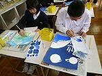 文字絵デザインが終わった生徒は印箱を彫刻刀で彫っています。