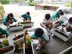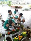美化委員会が、昼休みにマリーゴールド・ポインセチア・サルビアの花をプランターへ植える作業をしました。色とりどりの花が植えられ職員玄関前が、明るく素敵になりました。