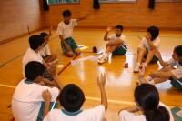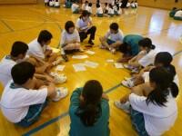 昨日講話集会終了後、6/12(水)に行われた三校交流の反省会を各班に分かれ体育館で実施しました。班ごとに輪になり班長中心で話し合いをしました。みんな真剣に感想や次回どうすれば良くなるか、また先生より助言を受けたりしていました。