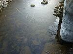 まだまだ、寒い日が続いています。藤川の水に氷が張っていました。氷の上に小石が乗っているのが、わかりますか?