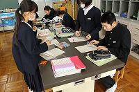 音楽の授業では、卒業ソング集を聴きながら楽譜を綴じていました。7人でクラス全員分を頑張って作っていました