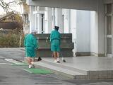 毎朝、校長先生と教頭先生が横断歩道のところに立って、生徒たちの登校を見守って