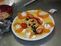 スープはジュリエンヌスープ、小皿はリヨネーズポテト、デザートは
