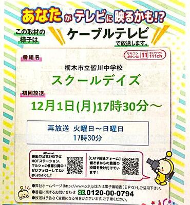 「中学校スクールデイズ」放映 投稿日時 : 12/01 皆川中管理者 12月1日(月)17:30~栃木ケーブルテレビで皆川中学校が紹介されました。 続きを読む この番組は、11月13日(木)にFMくらら857に出演した様子を栃木ケーブルテレビが撮影し、放映されたものです。2学期に本校や地域で行われた行事の紹介や校長先生による学校PRなど、以前ケーブルテレビで放映された映像や写真とともに紹介されました。本校の良さや温かな雰囲気がとてもよく伝わってきて嬉しかったです。 この番組は12月7日(日)まで、毎日17:30から15分間放映されます。皆さん、ぜひご覧くださいね! 閉じる {{options.likeCount}} {{options.likeCount}}