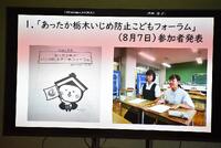 まず、夏休み中に皆川中代表として、生徒会長と副会長が参加した、「あったか栃木いじめ防止子どもフォーラム」についての話を聞きました。