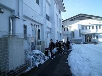 校舎北側は、ほとんど雪が残っている状態です。雪かきをした部分を通って生徒たちは次々と校舎内に入っていきました。