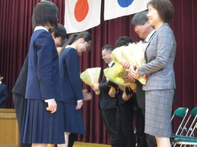 生徒たちにとって一番身近にいた担任の先生との別れは特別なものです。それぞれの教室で思いを伝え、最後のひと時をかみしめていました。また、卒業生や保護者および地域の方々も駆けつけ、先生方との別れを惜しんでいました。