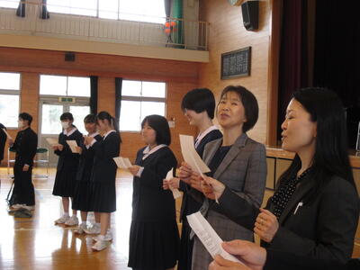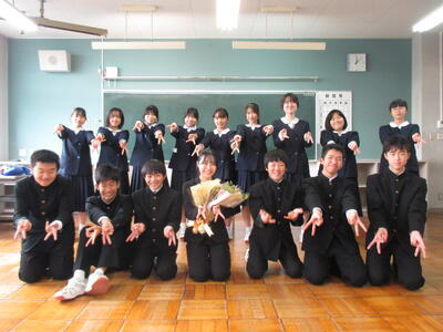 離任式では、12名の先生方を、生徒と共に栃木北中へ赴任する4名の職員で見送りました。さらに離任式の後にはサプライズで校長先生のご退職を祝い、Official髭dandismの「Chessboard」(校長先生のお気に入りの曲)をみんなで輪になって歌いました。