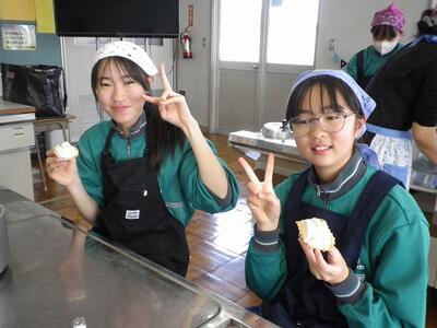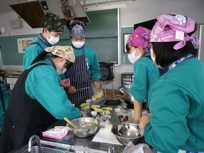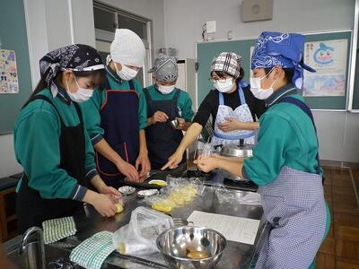 最初から調理実習の様子を見ることはできなかったのですが、どの班も協力してスイートポテトづくりに取り組んでいました。最近バターの値段が上がったようで、家庭科担当教員はマーガリンを使うか迷ったそうですが、やはり味・香りはバターが一番!ということで、材料に加えました。