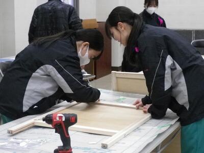 まず、電動のビスを打ち込む機械を使う練習です。小刻みにゆっくりビスを回していくのがコツのようです。だんだん慣れてきました。