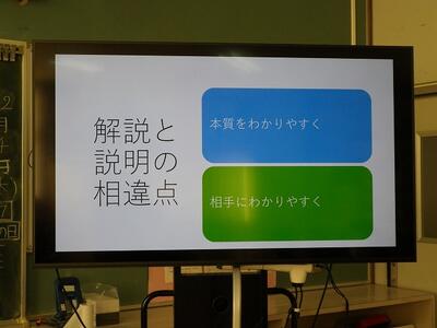 次は「解説と説明」についてです。先日の定期テストが返却されたとき、先生が「解説をします」と言いました。「解説」は、内容や本質を分かりやすく伝えることなのですが、普段あまり意識せずに使っていたことに気づきました。生徒たちはパワーポイントを小学校のときから使っており、見た目の分かりやすさ、操作など、スムーズに使いこなしています。