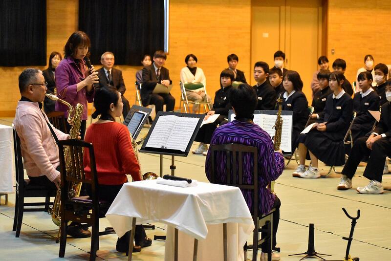 サクソフォンが奏でる音色に多くの生徒・職員が魅了されていました。私たちが知っている曲も演奏していただきました。全員で歌った「にじいろ」は思い出に残るものとなりました。素敵な時間をありがとうございました。