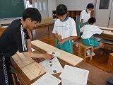 1年生も授業をがんばっています。1組の技術の授業では、作品集の中からそれぞれの作りたいものが最終決定。いよいよ製作がスタートです。直角定規を手に取り、みんな真剣に本棚やラックの切断線や仕上がり寸法線を書いていました。2組の家庭科の授業は中学生に必要な栄養についての学習でした。6つの食品群について学びました。