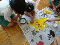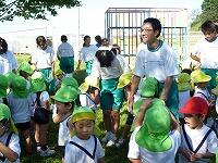 吹き絵の手伝いをしたり、園庭に出てしっぽ取りゲームをしたり、簡単なフォークダンスをしたりして、あっという間に時間が過ぎました。名残惜しいのですが、園児たち一人一人とタッチをしてお別れしてきました。
